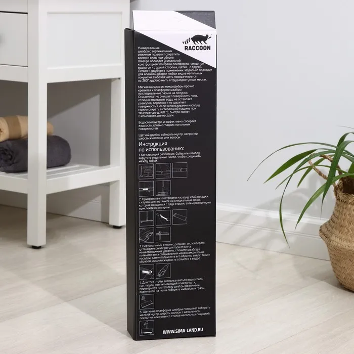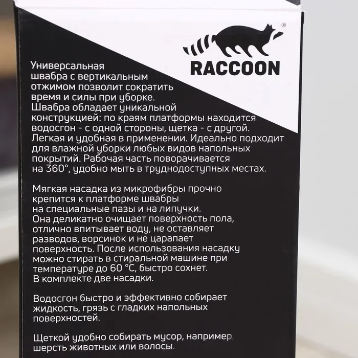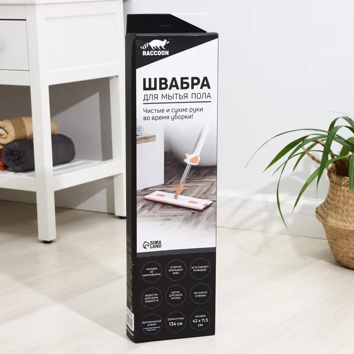 Швабра с отжимом, водосгоном и щёткой Raccoon, 2 насадки из микрофибры 42×11.5 см, стальная ручка 134 см — Характеристики