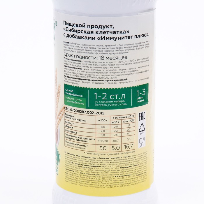 Регулярное употребление клетчатки «Иммунитет плюс» с имбирем и хвоей: улучшает работу кишечника, нормализует вес и обмен веществ, обогащает рацион растительными волокнами, предотвращает болезни, связанные с неправильным питанием, очищает пищеварительный тракт, дарит организму лёгкость и хорошее настроение.