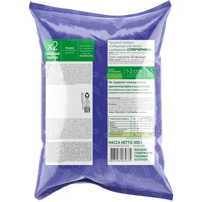 Ягодно-злаковый микс Сибирская клетчатка Суперчерника восстанавливает кишечную микрофлору, повышает иммунитет, нормализует обмен веществ.