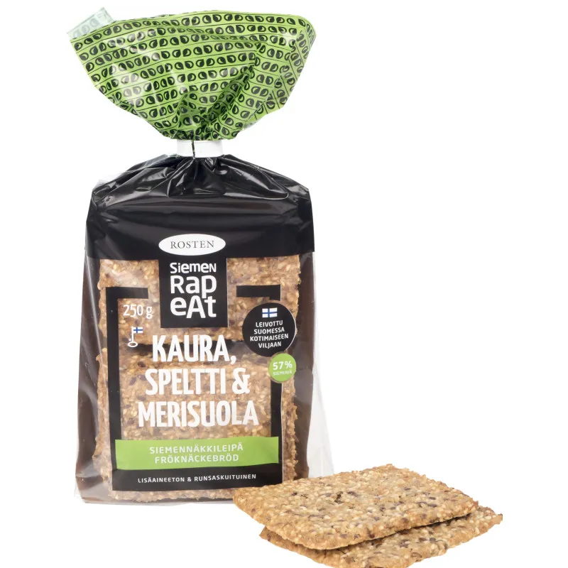 Семенное хрустящее хлебце с овсом, спельтой и морской солью - это богатый клетчаткой, протеинами и полезными жирами здоровый перекус. Готовые кусочки вкусны сами по себе, но вы можете добавить к ним множество различных начинок. Попробуйте, например, холодного копченого лосося или белую фасолевую пасту. Хрустящие семенные хлебцы Rosten выпекаются в Финляндии из местного зерна.