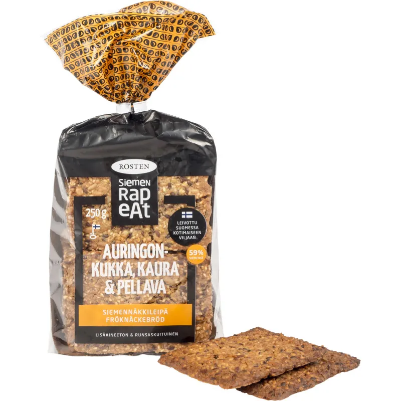 Rosten - это хрустящие семенные хлебцы, выпекаемые в Финляндии из местного зерна. Семенной хлебец с подсолнечником, овсом и льном богат клетчаткой и белком, а также содержит полезные жиры, что делает его отличным выбором для здорового перекуса. Готовые кусочки вкусны сами по себе или могут быть дополнены различными начинками. Попробуйте с холодным копченым лососем или пастой из белой фасоли. Без лактозы. Содержит 59% семян. Упаковка: 12 штук / 250 г.