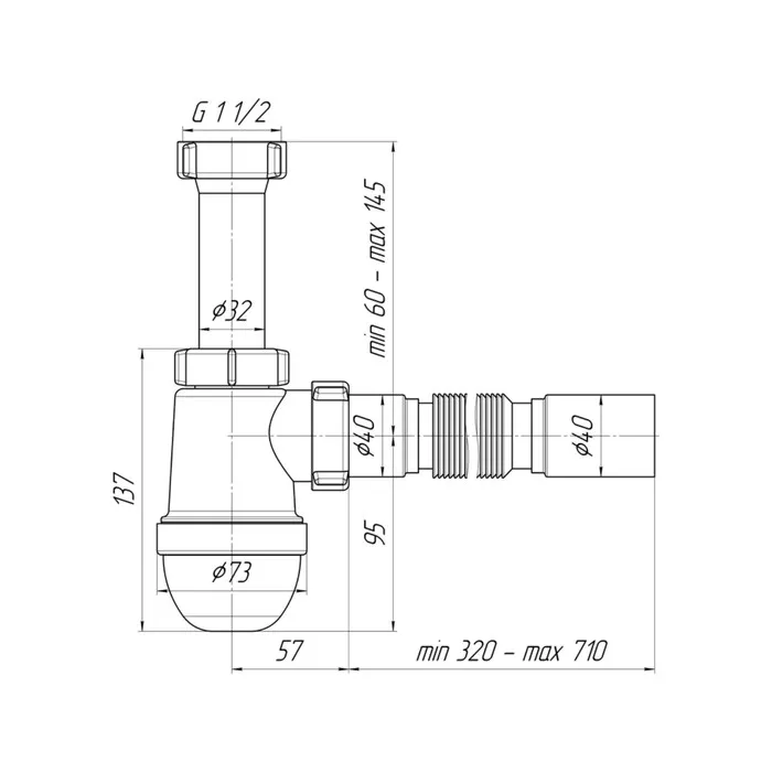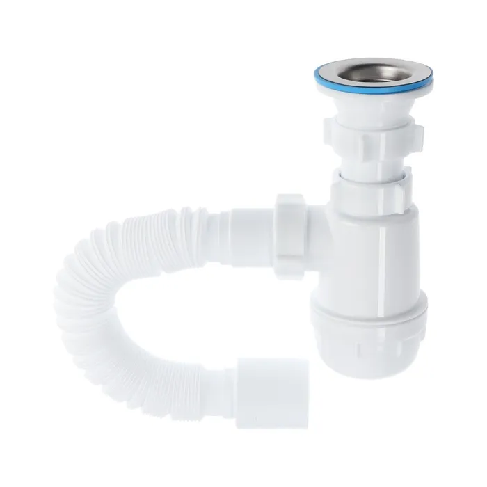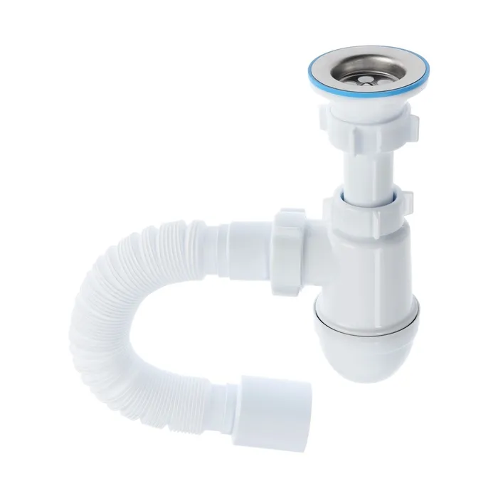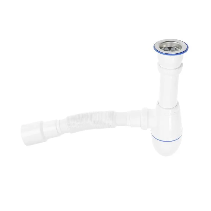 Сифон предназначен для кухонной мойки бутылочного типа. Изделие без выпуска. Для подключения к канализации комплектуется гибкой трубой размером 40 × 40 мм.