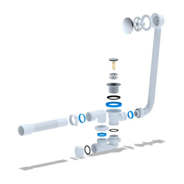 Сифон имеет возможность регулировки по трем направлениям: вокруг выпуска ванны, изменение направления слива воды в канализацию при помощи уголка, изменение высоты сифона при помощи уголка (минимальное).