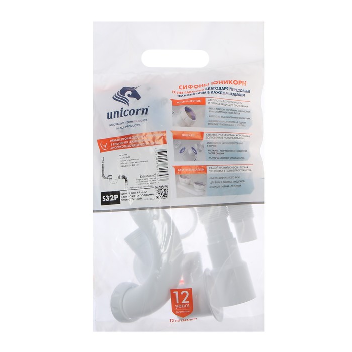 Сифон для ванны Unicorn S32P, 1 1/2"х40 мм, пластиковый выпуск и перелив, гофра 40×40/50 мм — Характеристики