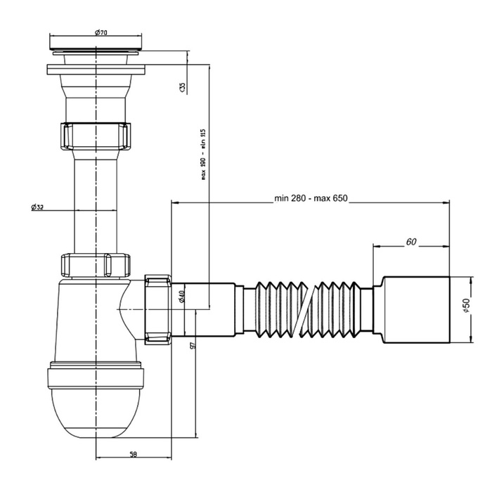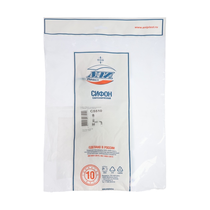 Сифон универсальный «АНИ Пласт» Варяг C5510, 1 1/2" х 40 мм, с гибкой трубой 40×50 мм — Характеристики