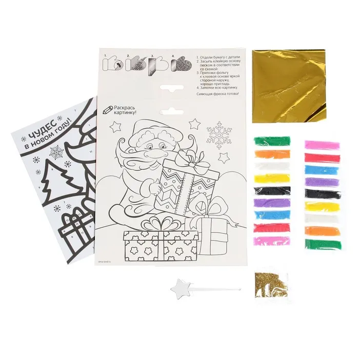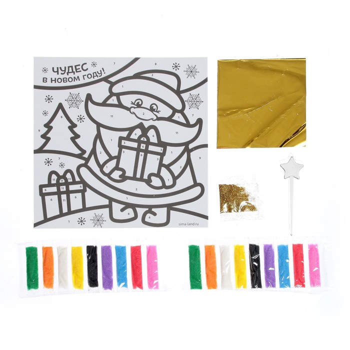 Процесс создания картины из песка прост и увлекателен. Снимите верхний слой с одного сектора картинки и засыпьте его песком, блёстками или заполните фольгой, помогайте стекой. Можете ориентироваться на цифры в секторах и подсказку на упаковке или пофантазировать и создать свою уникальную картину!