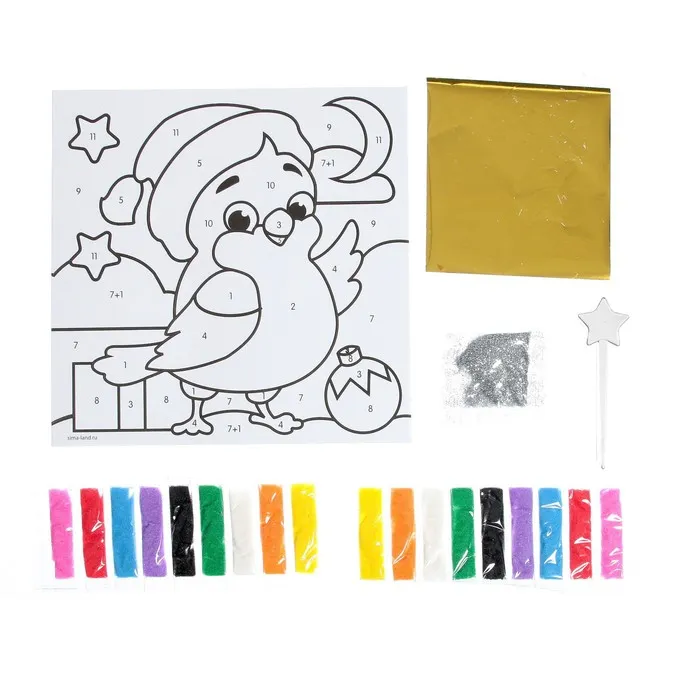 Процесс создания картины из песка прост и увлекателен. Снимите верхний слой с одного сектора картинки и засыпьте его песком, блёстками или заполните фольгой, помогайте стекой. Можете ориентироваться на цифры в секторах и подсказку на упаковке или пофантазировать и создать свою уникальную картину!