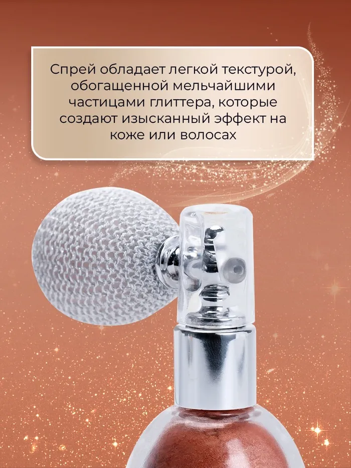 Сияющий глиттер-спрей в оттенке бронза — это уникальное средство для придания вашему образу яркости и блеска. Спрей обладает легкой текстурой, обогащенной мельчайшими частицами глиттера, которые создают изысканный эффект на коже или волосах.