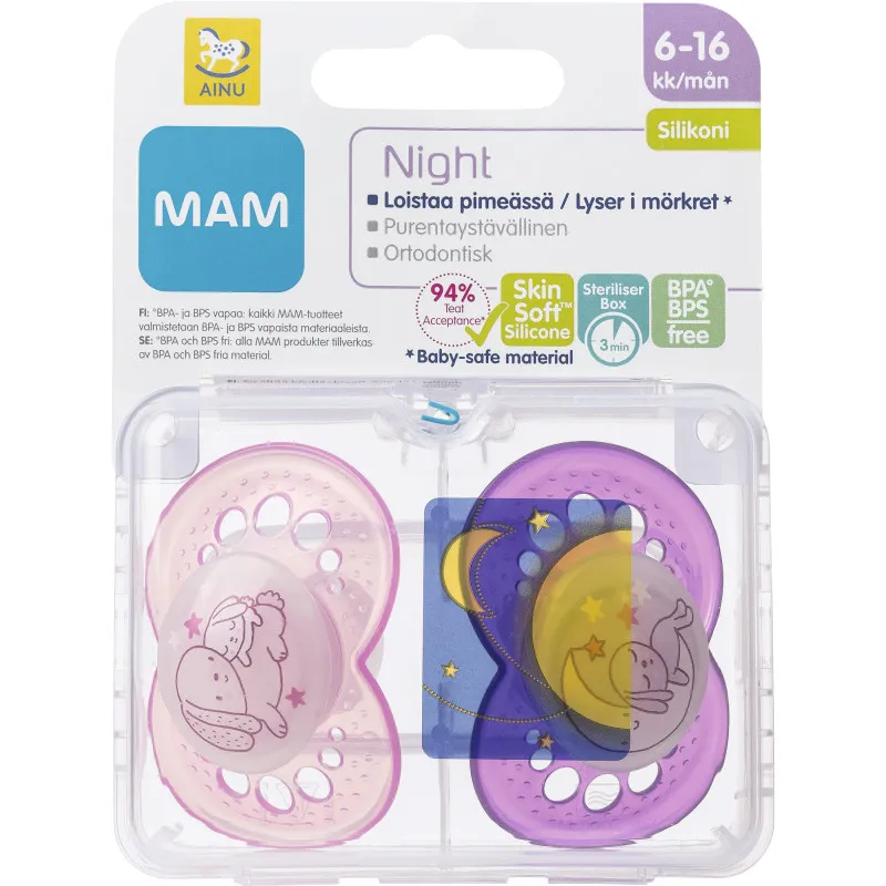 Светящаяся в темноте силиконовая пустышка облегчает ее нахождение ночью. Пустышка разработана так, чтобы всегда быть в правильном положении во рту малыша, что делает ее удобной и безопасной в использовании. Легко очищается и может быть стерилизована в микроволновке в собственном футляре. В упаковке две пустышки.