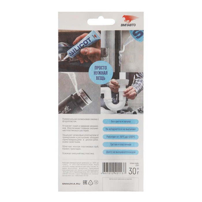 Универсальная силиконовая смазка «SILICOT» подходит для тысячи применений: для смазывания задвижек, механизмов замков, кранов, направляющих, резиновых уплотнений, трубопроводов, беговых дорожек и т. д. Мелкодисперсные частицы PTFE в зонах контактного взаимодействия образуют тонкую разделительную пленку, которая способна при определённых условиях значительно снижать коэффициент трения. А при недостаточном смазывании образовавшаяся плёнка способна некоторое время разделять трущиеся поверхности. Благодаря уникальным физико-химическим свойствам, PTFE способен сохранять свои эксплуатационные характеристики даже при работе в агрессивных средах в широком интервале температур.