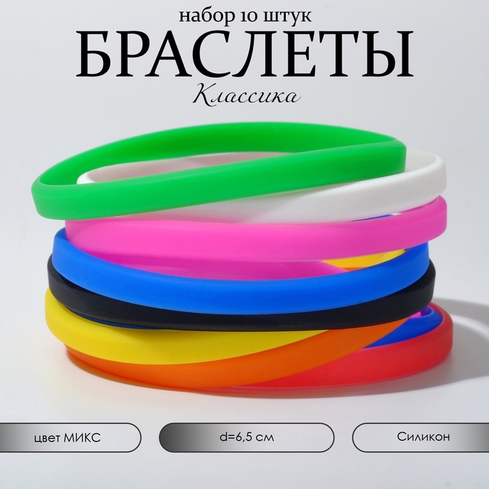 Силиконовый браслет в наборе из 10 штук – это яркое и многофункциональное украшение, которое идеально подходит для создания уникальных образов. Каждое украшение в наборе выполнено в различных оттенках, что позволяет легко сочетать их и подбирать к любому наряду. С диаметром 6,5 см, браслеты тянутся и подходят для любой руки, обеспечивая комфортное ношение.