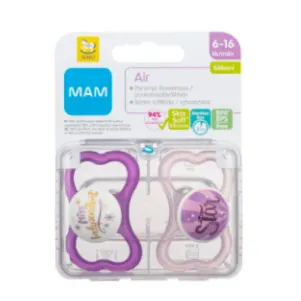Для самой прекрасной улыбки в мире! Ортодонтическая форма соски Mam поможет развитию у ребенка правильного прикуса. Пустышка Ainu Mam Air отлично пропускает воздух благодаря особо крупным отверстиям, позволяя коже дышать. Инновационный дизайн. Особо легкая и приятная, не раздражает и не травмирует чувствительную кожу. Силиконовая соска с покрытием SkinSoft по текстуре напоминает материнскую кожу и делает переход от груди легким и естественным, 94% детей принимают такую соску. Успокаивает малыша и дарит комфортное ощущение. Безопасный и удобный ограничитель не позволяет малышу проглотить пустышку. Стерилизация в контейнере для переноски за 3 минуты, обеспечивает гигиеничность пустышки на 48 часов. Наполните контейнер водой, примерно на 25 мл. Вложите в него пустышки, закройте и поместите в микроволновую печь на 3 минуты при 750-1000 ватт.