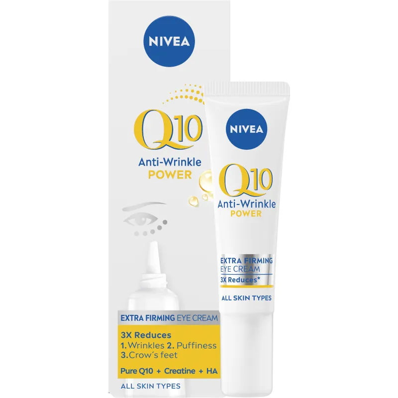 Nivea Q10 Anti-Wrinkle Power - это крем для век, обогащённый чистым коэнзимом Q10, который придаёт энергию клеткам кожи и уменьшает морщины изнутри. Содержит креатин для усиления выработки коллагена и эластина, а также гиалуроновую кислоту для увлажнения кожи и удержания влаги. Этот крем без ароматизаторов делает кожу вокруг глаз увлажнённой и молодой на вид. Эффективность клинически доказана. Подходит для всех типов кожи.