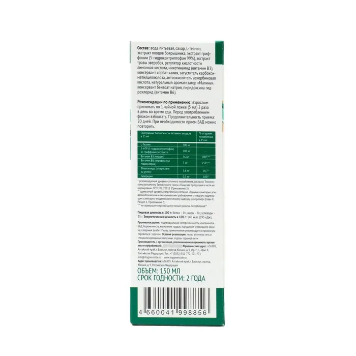 Состав: Вода питьевая, сахар, L-теанин, экстракт плодов боярышника, экстракт гриффонии (5-гидрокситриптофан 99%), экстракт травы зверобоя, регулятор кислотности лимонная кислота, никотинамид (витамин В3), консервант сорбат калия, загуститель карбоксиметилцеллюлоза, антиокислитель аскорбиновая кислота, натуральный ароматизатор «Малина», консервант бензоат натрия, пиридоксина гидрохлорид (витамин В6).