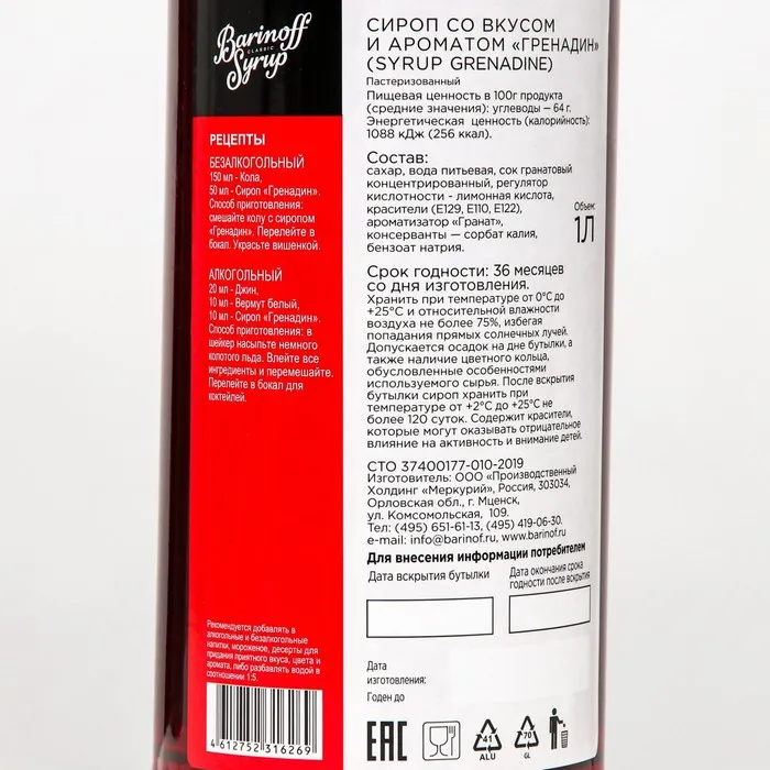 Состав: сахар, вода питьевая, сок гранатовый концентрированный, регулятор кислотности – лимонная кислота, красители – Е129, Е110, Е122, ароматизатор «Гранат», консерванты – сорбат калия, бензоат натрия.