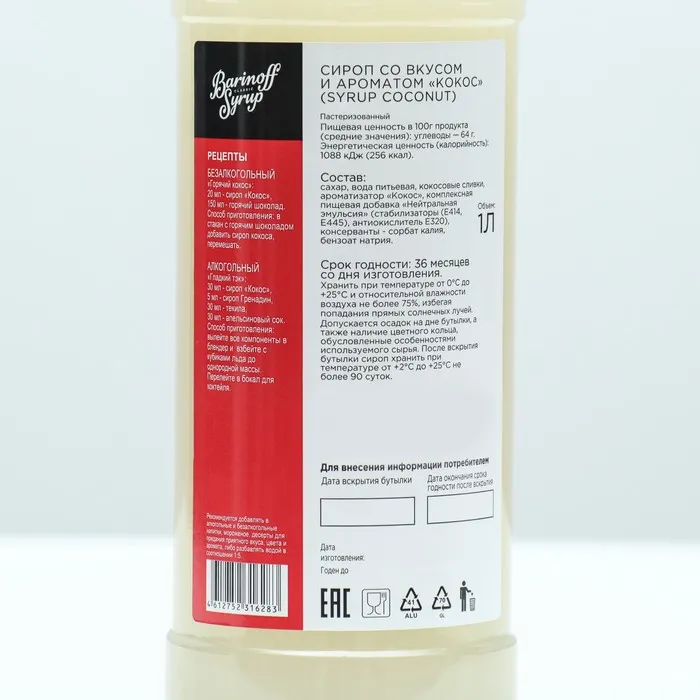 Состав: сахар, вода питьевая, кокосовые сливки, ароматизатор «Кокос», гидрогенизированное кокосовое масло, стабилизатор E414, антиокислитель E307, консерванты – сорбат калия, бензоат натрия.
