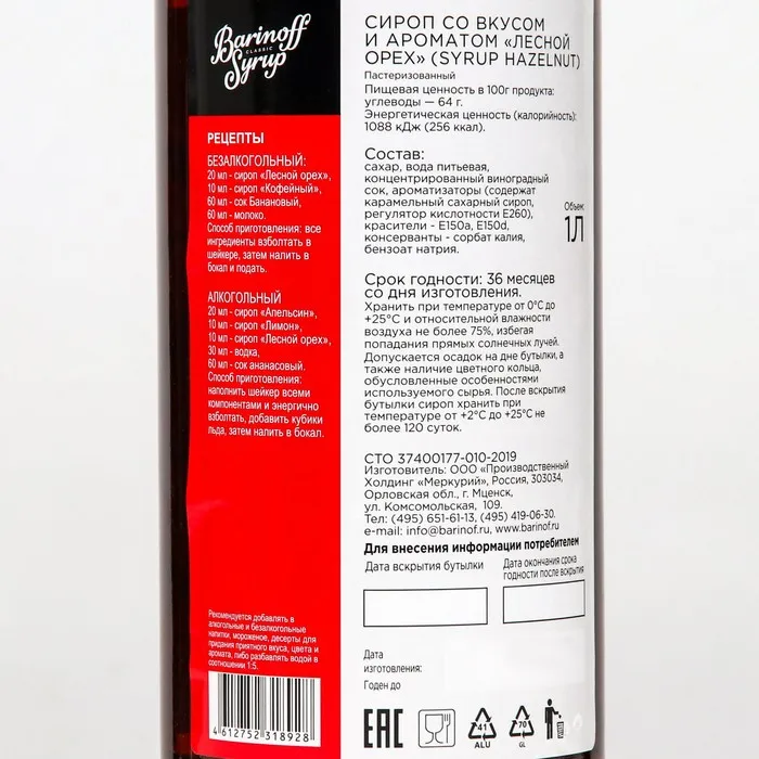Состав: сахар, вода питьевая, сок виноградный концентрированный, ароматизатор «Лесной орех», консерванты – сорбат калия, бензоат натрия.