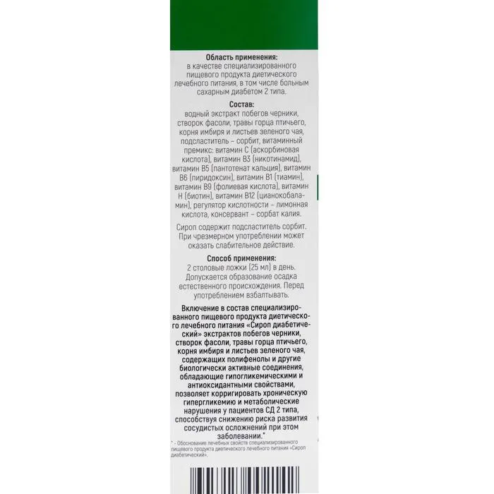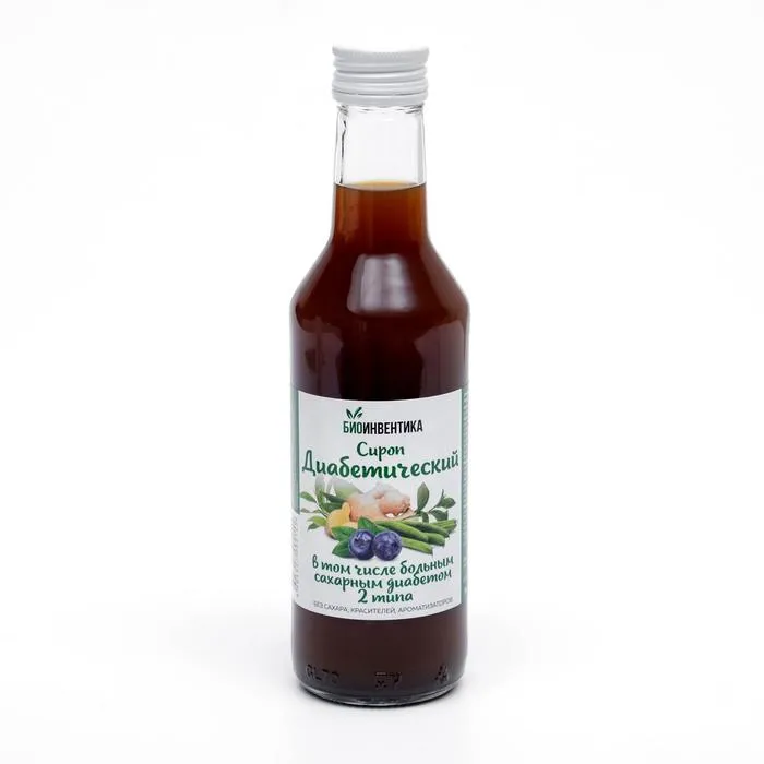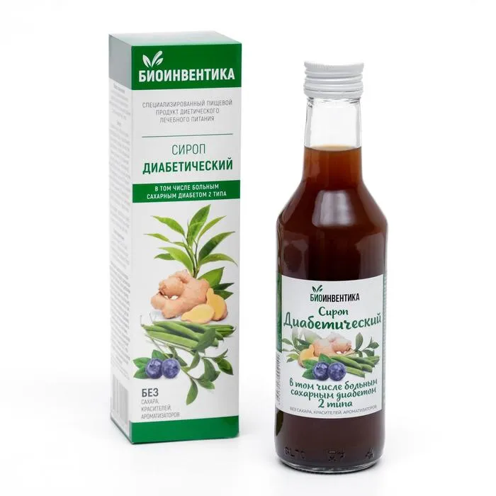 Сироп диабетический - продукт разработан специалистами компании ООО «Биоинвентика» для больных диабетом 2 типа, профилактики диабета и использовании в комплексной терапии для лечения этого заболевания. Этот природный продукт на основе традиционно используемых для лечения СД экстрактов побегов черники, створок фасоли, горца птичьего, усилен введением в рецептуру корня имбиря и листьев зеленого чая, а также обогащен комплексом поливитаминов.