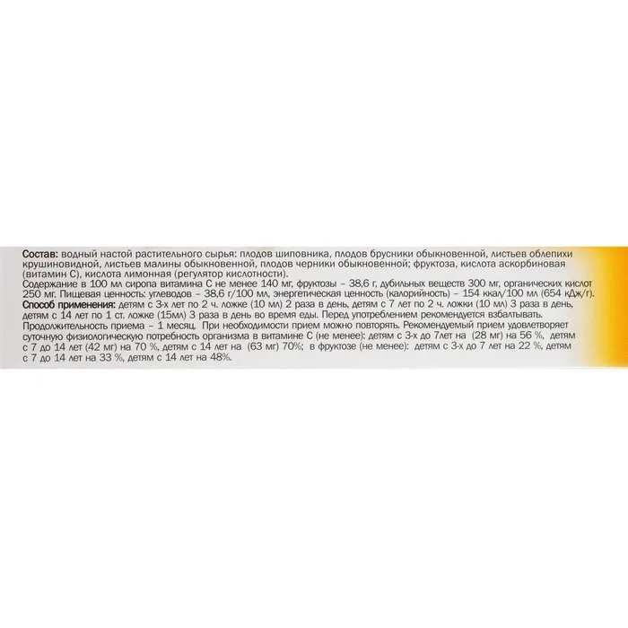 Рекомендуется применять в сезон простуд, в холодное время года, при авитаминозе, при пониженном иммунитете, при частых заболеваниях простудой, гриппом, для профилактики ОРЗ, ОРВИ. Сироп изготовлен на основе фруктозы и обогащен витамином С. Обладает противовирусным, антитоксическим, общеукрепляющим, иммуностимулирующим действиями. Не содержит консервантов, ароматизаторов и красителей.
