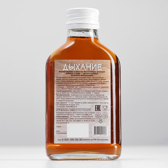 Состав: Водный настой лекарственных растений: почек сосны, мать-и-мачехи, подорожника, овса посевного, липы, кориандра, мяты, базилика; сахар.