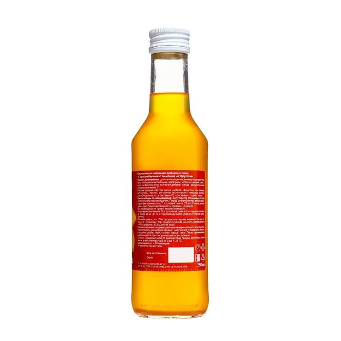 Натуральный сироп из имбиря обогащен свежеотжатым соком лимона и обладает необычным, ярко выраженным вкусом и пикантным ароматом. Незаменим при простуде, благоприятно влияет на пищеварительную систему, хорошо влияет на работоспособность, дарит прилив сил и бодрости, выводит из организма токсины, тонизирует, служит профилактическим средством от тромбообразований и инсульта. Лимон придает продукту неповторимый вкус и аромат. Фруктоза – природный сахар, содержится в различных фруктах и ягодах. Она почти в два раза слаще сахара, при ее применении количество необходимого сахара можно снизить на 30-50%, что позволяет уменьшить количество калорий, а это очень важно для людей, следящих за своим весом и больным диабетом. Кроме того, вкус и аромат свежих ягод проявляется ярче. Благодаря особому обмену в организме фруктоза помогает адоптации организма человека при длительном состоянии напряжения как умственном, так и физическом, например, вождение автомобиля, спорт, работа с компьютером и т.д. Использование фруктозы в отличие от всех остальных сахаров не вызывает кариес. Фруктоза ускоряет метаболизм алкоголя в организме человека, применяется при лечении отравления алкоголем.