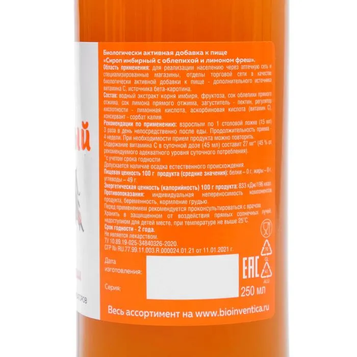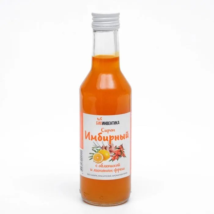 Сироп имбирный с облепихой и лимоном фреш - натуральный сироп производится из свежеприготовленного водного экстракта корня имбиря, сока облепихи прямого отжима с добавлением сока лимона прямого отжима.