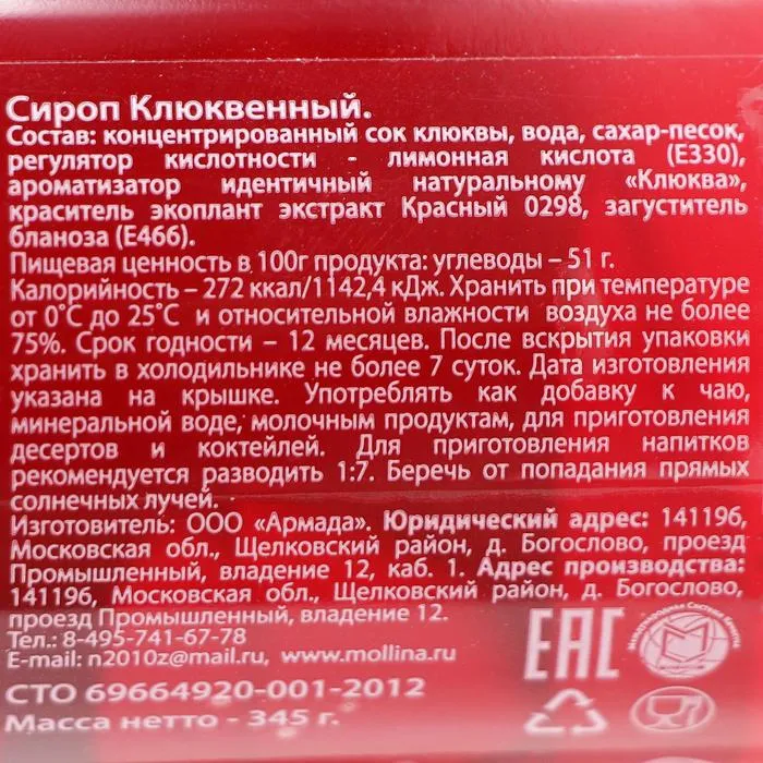 Состав: концентрированный сок клюквы, вода, сахар-песок, регулятор кислотности- лимонная кислота (Е330), ароматизатор идентичный натуральному «Клюква», краситель - экоплант экстракт Красный 0298, загуститель бланоза(Е466). Пищевая ценность в 100 г продукта: углеводы – 51 г. Калорийность – 272 ккал/1142,2 кДж.