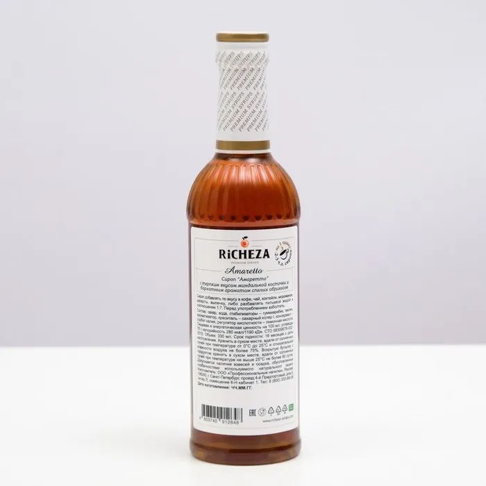 «Амаретто» - сладкий итальянский ликёр на основе горького миндаля, абрикосовых косточек и пряностей. Сироп «Амаретто» от RiCHEZA идеально воспроизводит вкус этого классического десертного ликёра. Он может быть использован вместо одноимённого ликёра в безалкогольных коктейлях. Отлично сочетается с кофе и напитками на основе эспрессо, а также чаем и горячим шоколадом. Идеален для приготовления молочных напитков, мороженого и десертов.