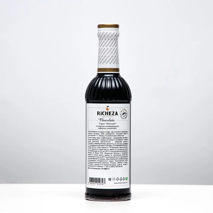 Сироп «Шоколад» от RiCHEZA - практически универсальный сироп. Он служит основой для кофейных напитков, молочных и безалкогольных коктейлей, десертных напитков! На данный момент «Шоколад» занимает лидирующие позиции среди сиропов кофейного направления за счет правильного вкуса классического горького шоколада и универсальности использования.