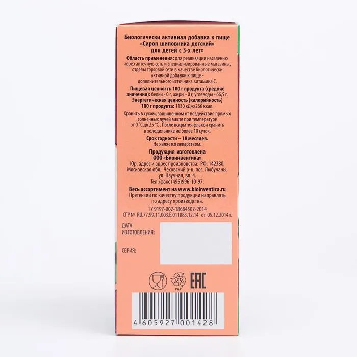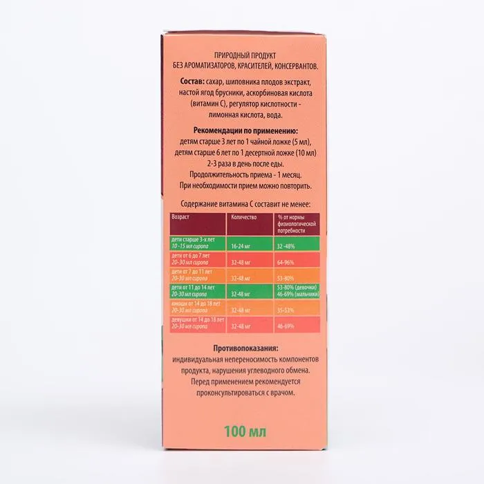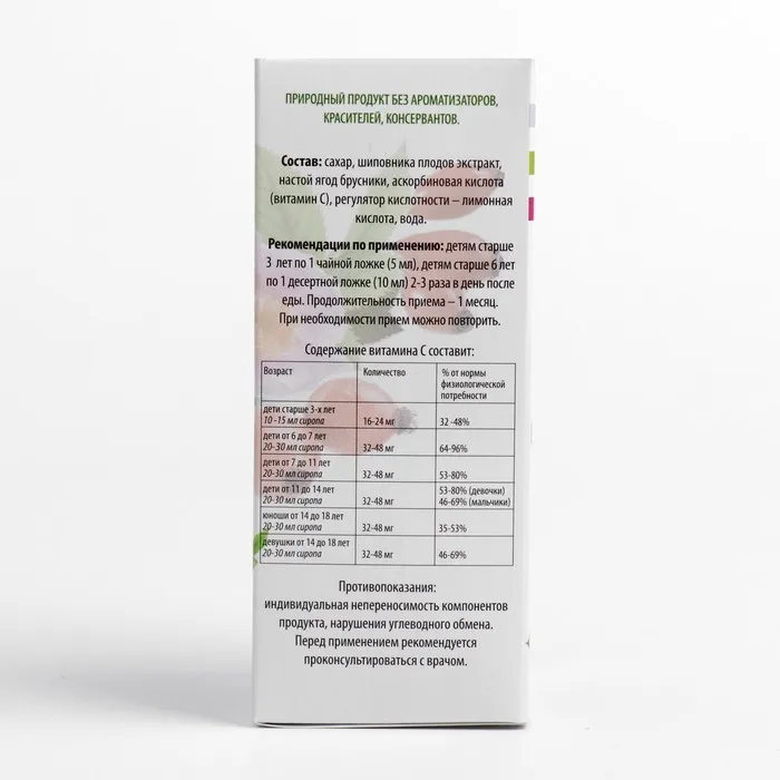 Состав: сахар, шиповника плодов экстракт, настой ягод брусники, аскорбиновая кислота (витамин С), регулятор кислотности - лимонная кислота, вода.