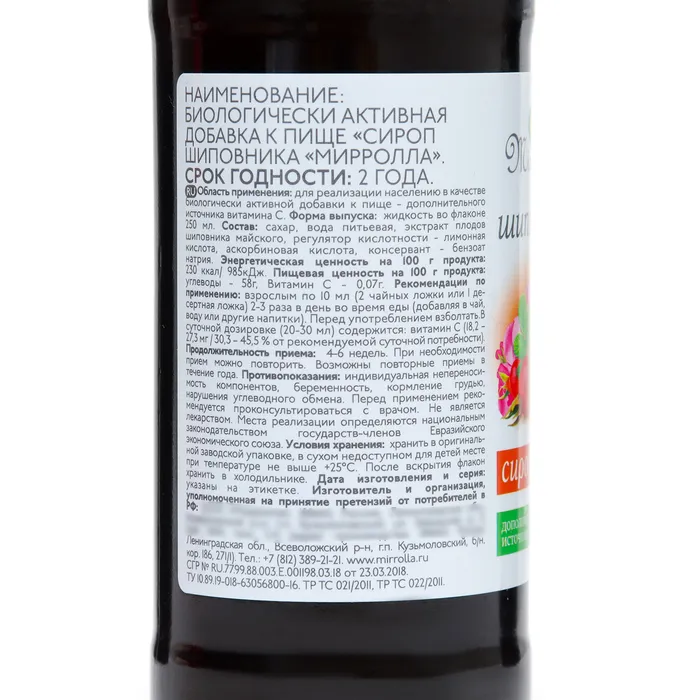 Состав: экстракт плодов шиповника майского, аскорбиновая кислота, вспомогательные компоненты (сахар, Е330 (лимонная кислота — регулятор кислотности), Е211 (бензоат натрия — консервант)).
