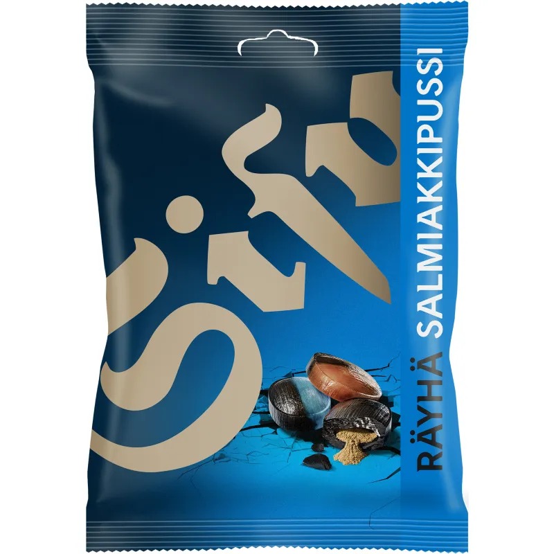 Sisu Räyhä — это первый выбор для фанатов твердых конфет с салмиакки! В пакете представлены три вкуса: перец-салмиакки, лимон-салмиакки и персик-салмиакки. Внутри каждой конфеты скрывается интенсивный порошок салмиакки.