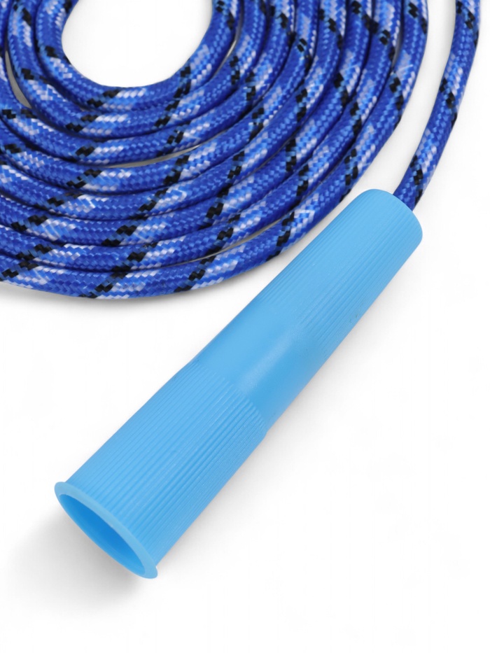 Скакалка выполнена из прочного троса с оплёткой и оснащена пластиковыми рифлёными ручками, которые удобно лежат в руке и не выскальзывают во время движения.