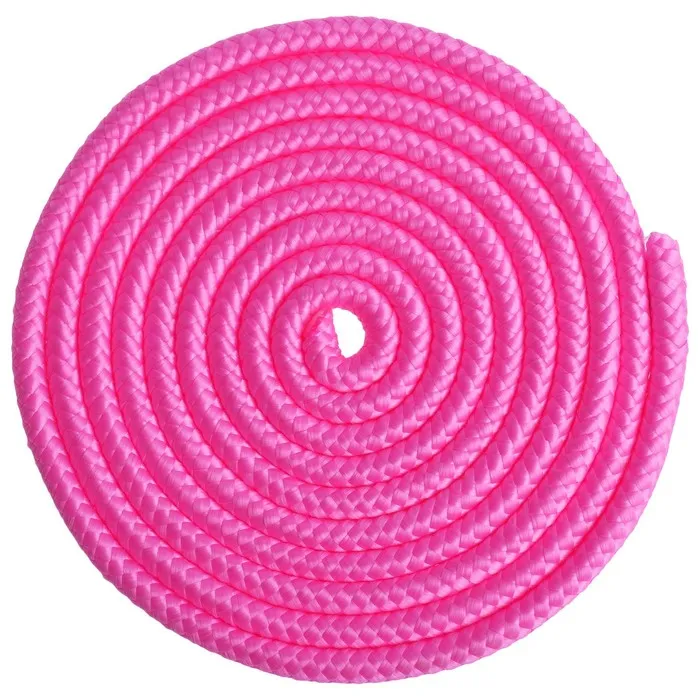 Скакалка предназначена для тренировки юной гимнастки. Яркий цвет инвентаря дополнит образ спортсменки.