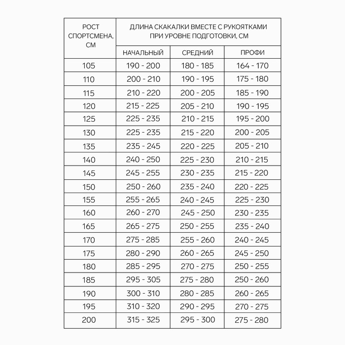 Длина скакалки играет важную роль в эффективности тренировки, а также влияет на технику выполнения прыжков. Существует несколько уровней длины, которые соответствуют разным степеням подготовки спортсменов.