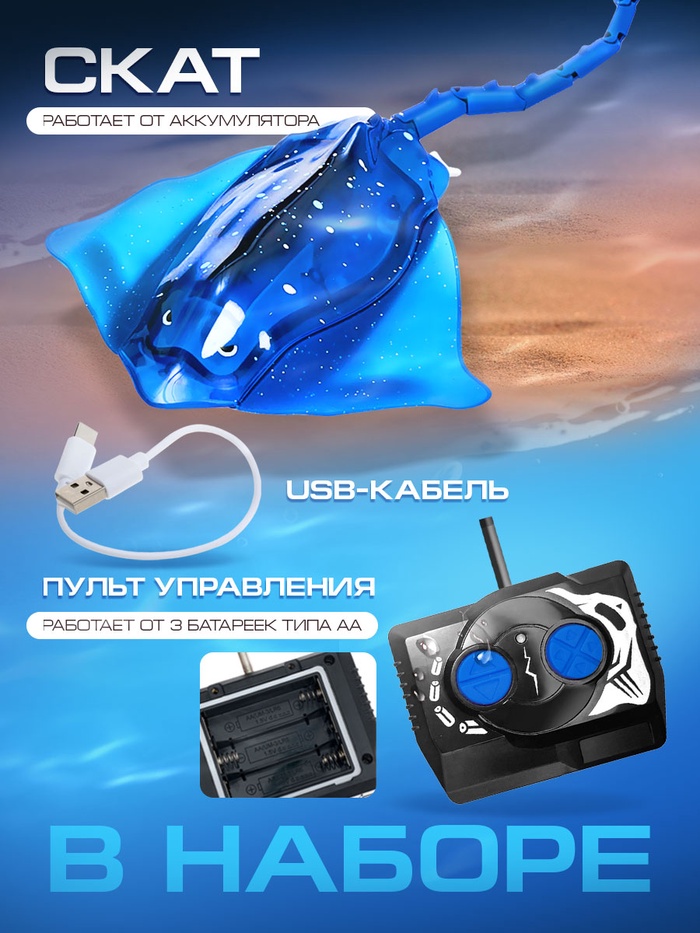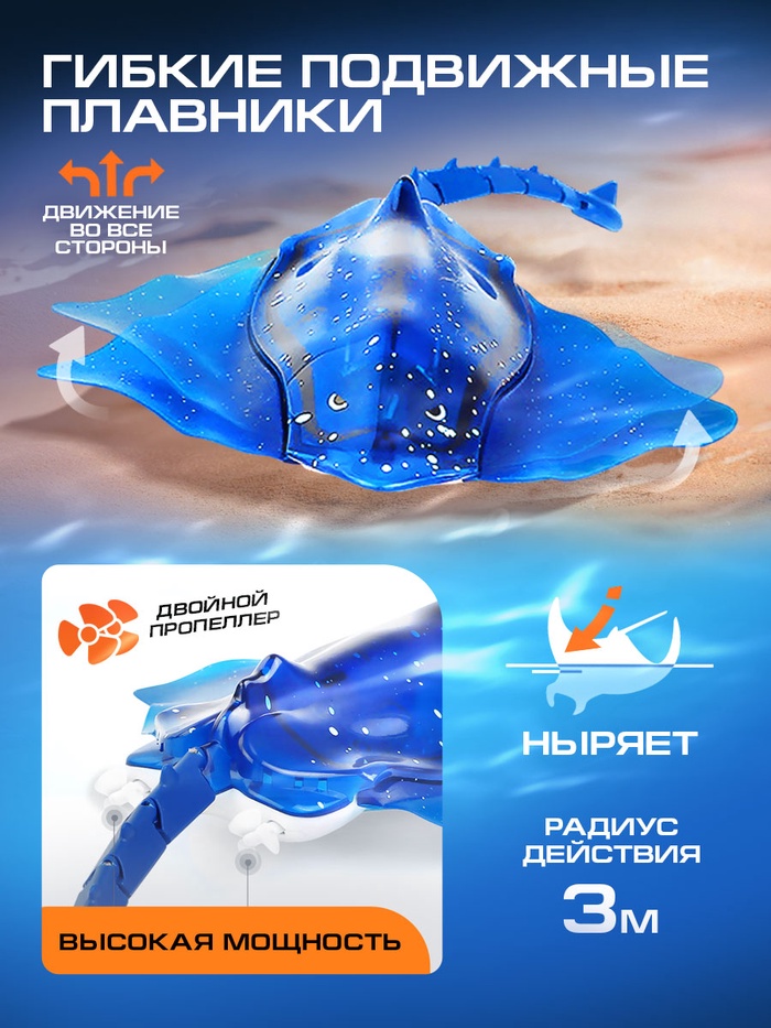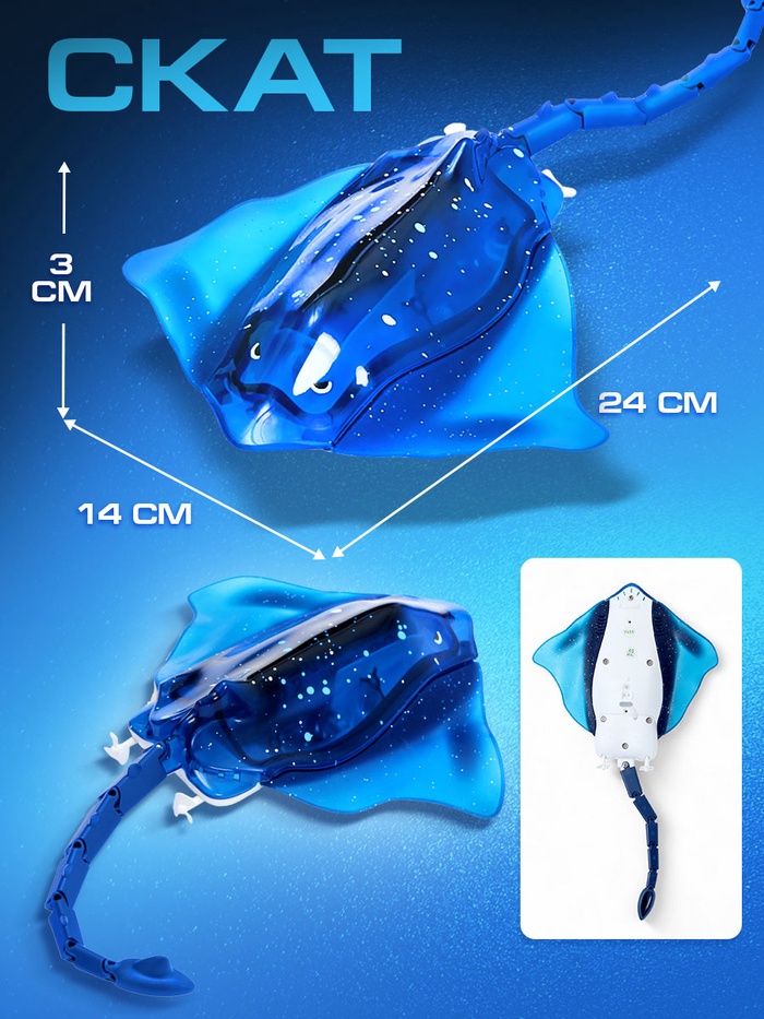 - Реалистичное движение: игрушка плавает вперёд и назад, выполняет повороты влево и вправо. Двойной пропеллер обеспечивает плавный ход и маневренность. Скат двигается в толще воды, создавая полную иллюзию живого существа.