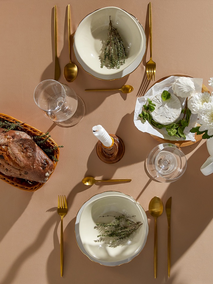 - Однотонный бежевый цвет сочетается с разной посудой и интерьерами.