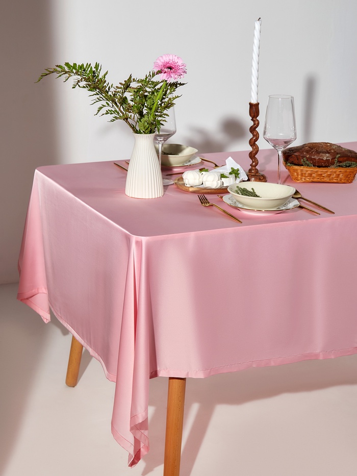 Розовая сатиновая скатерть для прямоугольного стола создаёт нежный и аккуратный фон для ежедневных обедов и особых поводов. Её гладкая фактура и насыщенный однотонный цвет розы привносят в столовую лёгкое весеннее настроение, которое останется с вами в любой сезон.