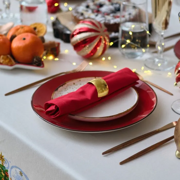 Столовый набор украсит праздничный интерьер. Изделия с эксклюзивным принтом сшиты из хлопкового полотна. Этот материал имеет плотную и упругую структуру, обладает высокой прочностью и на ура справляется с первостепенными задачами: