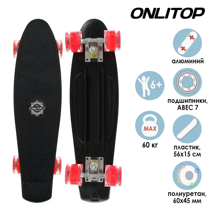 Скейтборд ONLITOP, 56x15 см, колёса световые PU 60х45 мм, алюминиевая рама, цвет МИКС — Характеристики