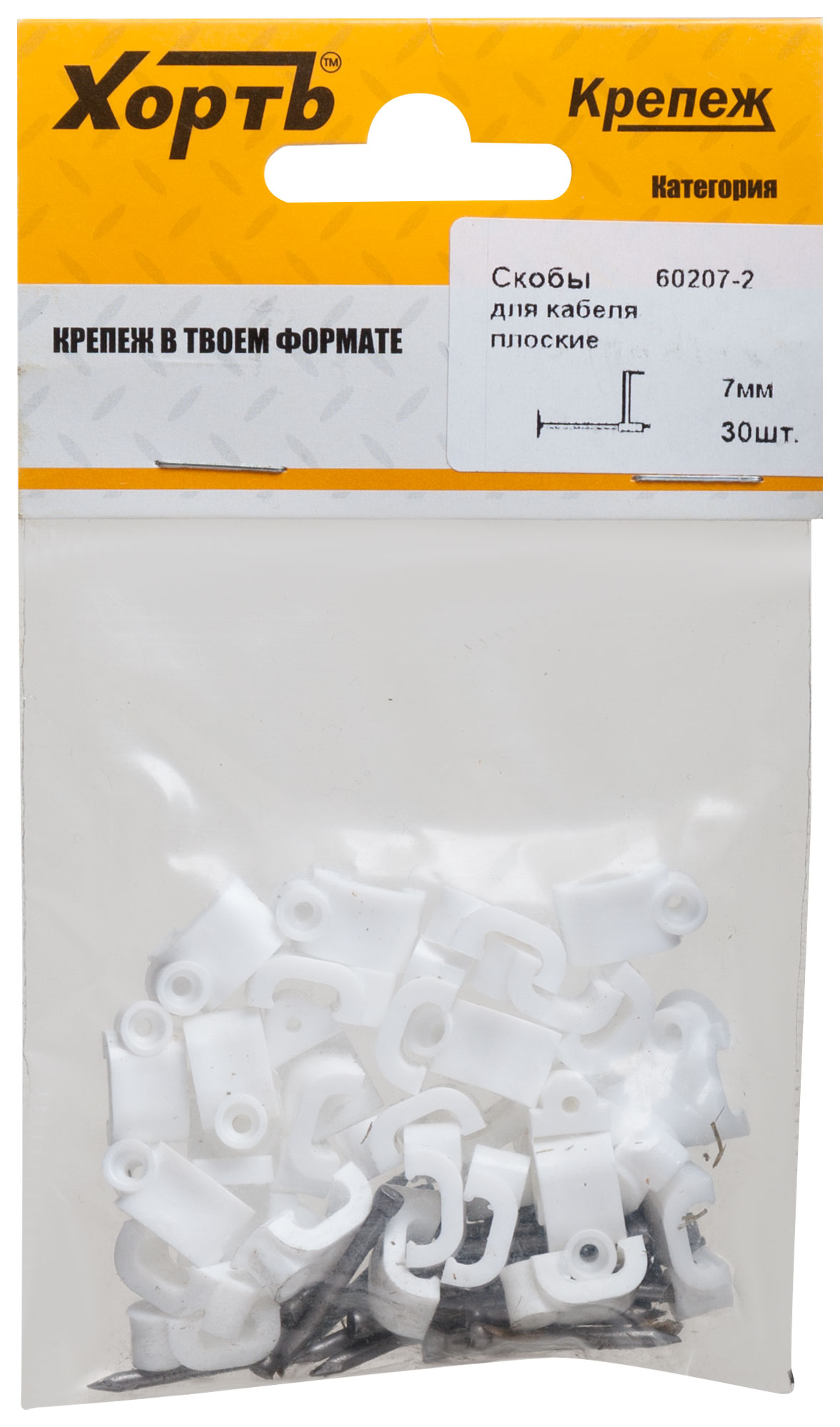 Скобы выполнены в плоском формате, что позволяет минимизировать выступание над поверхностью и обеспечивает эстетичный внешний вид. Фасовка из 30 штук оптимальна для небольших проектов, а размеры скоб — 7 мм — делают их универсальными для большинства стандартных кабелей.