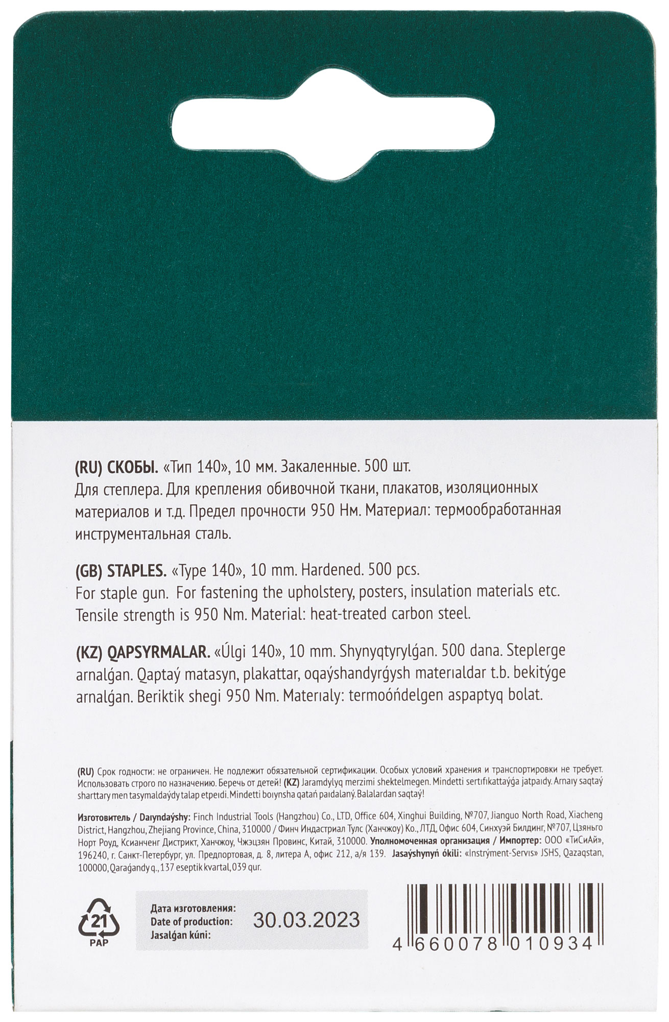 Упаковка содержит 500 скоб, что позволяет выполнять большой объём работ без частых замен. Ширина скобы 10,6 мм, что делает их универсальными для многих моделей степлеров.