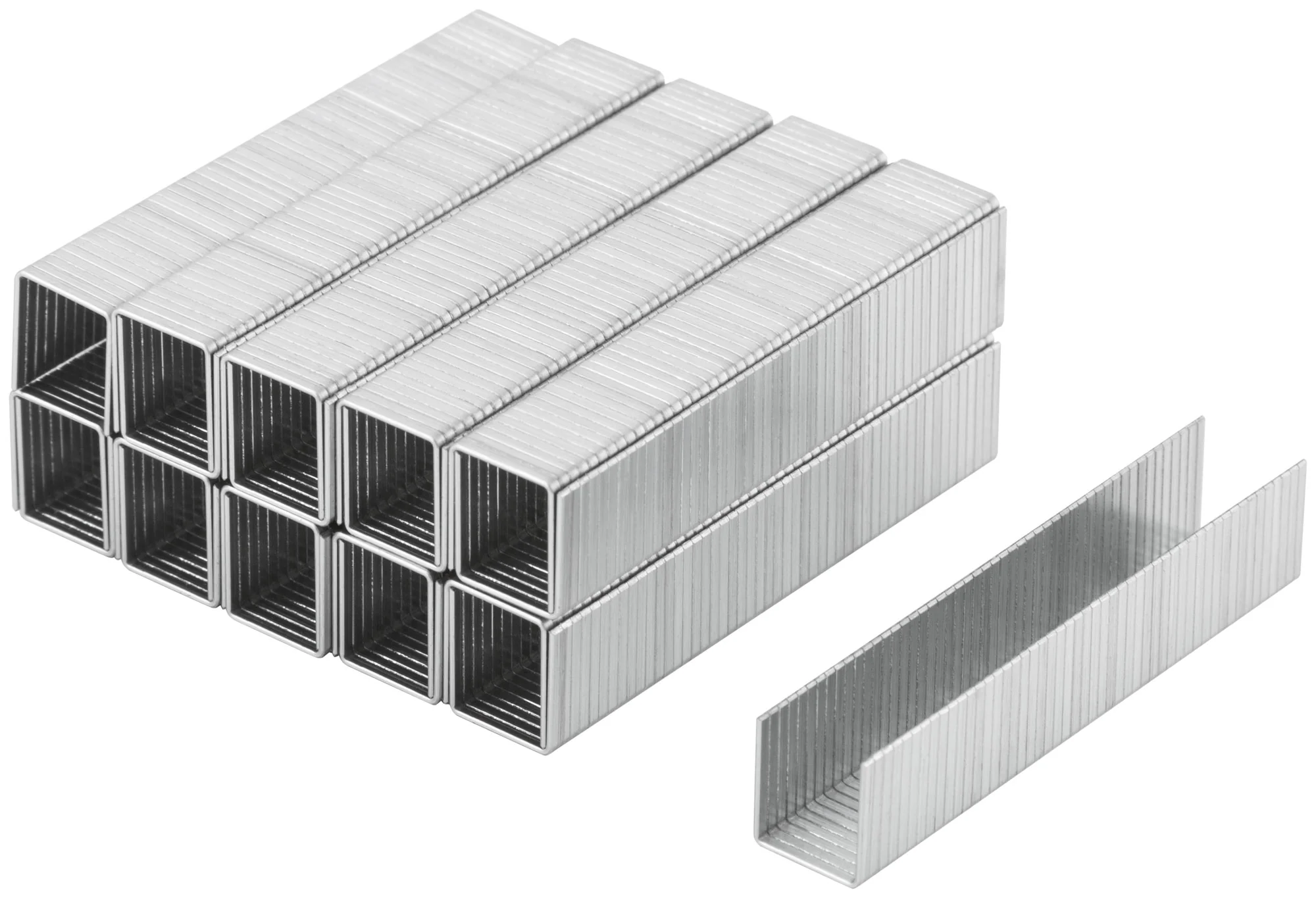 Скобы изготовлены из закалённой стали, что обеспечивает их долговечность и высокую прочность. Широкие прямоугольные скобы с шириной 10,6 мм и высотой 12 мм обеспечивают надёжное крепление, подходящее для различных типов материалов.