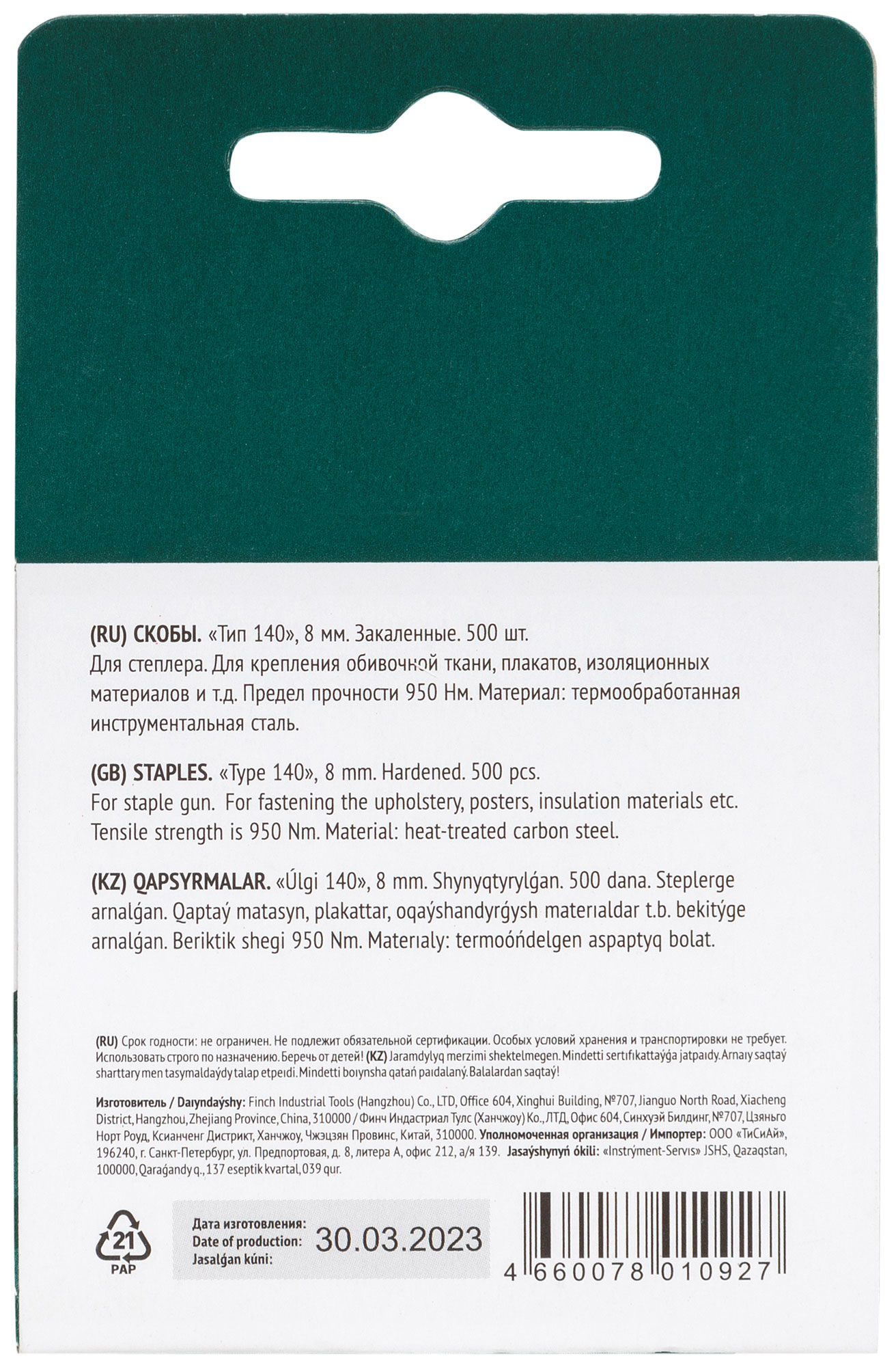 Эти скобы, тип 140, упакованы в удобную коробку с подвесом, что облегчает хранение и транспортировку. В комплект входит 500 штук, что делает их экономичным выбором для больших объёмов работ.