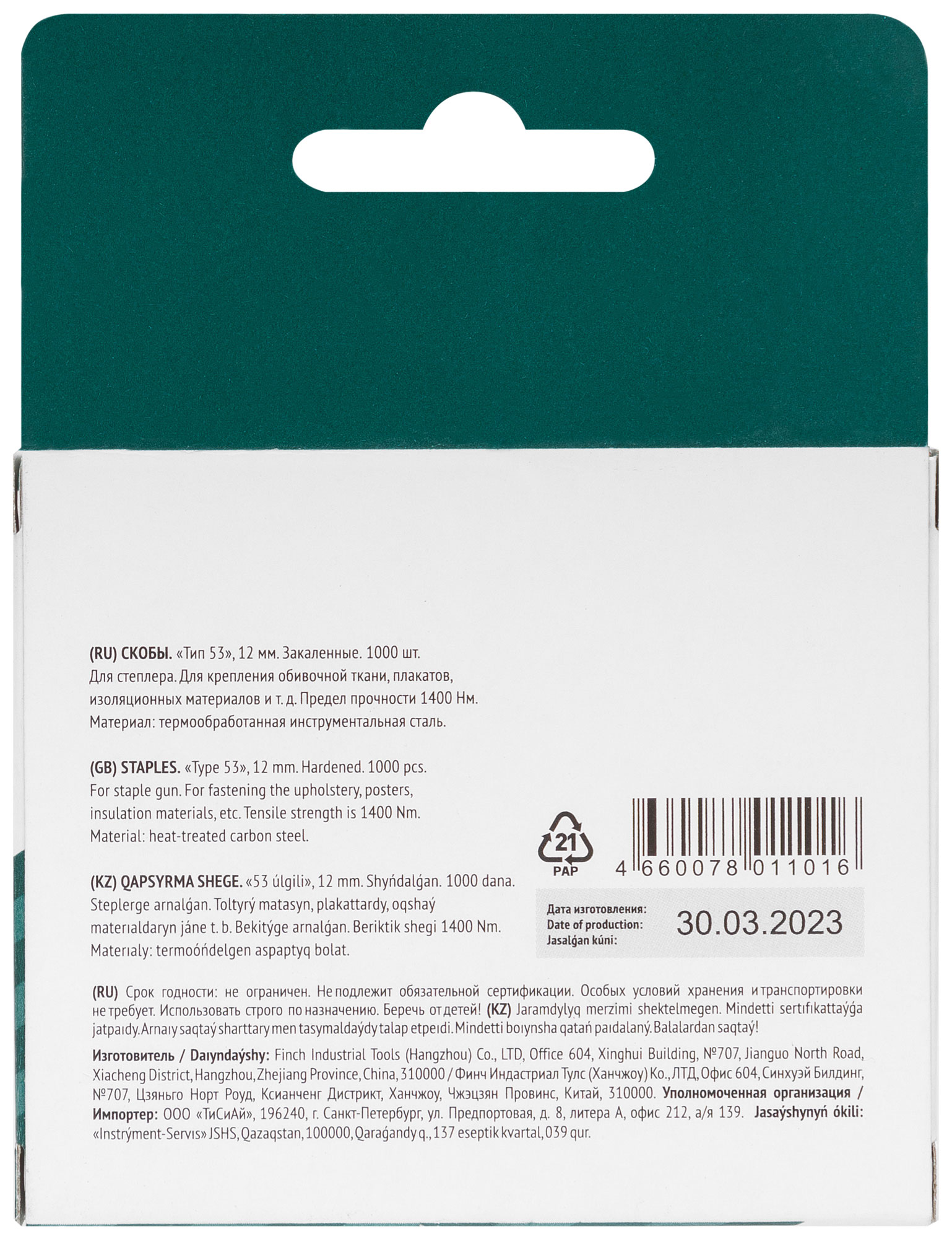 Эти скобы изготовлены из закалённой стали, что обеспечивает их прочность и долговечность. Прямоугольная форма и узкая ширина 11,3 мм позволяют использовать их в степлерах различных моделей, включая 32081, 32084, 32086 и другие. Упакованы в удобную коробку с подвесом, что облегчает хранение и транспортировку.