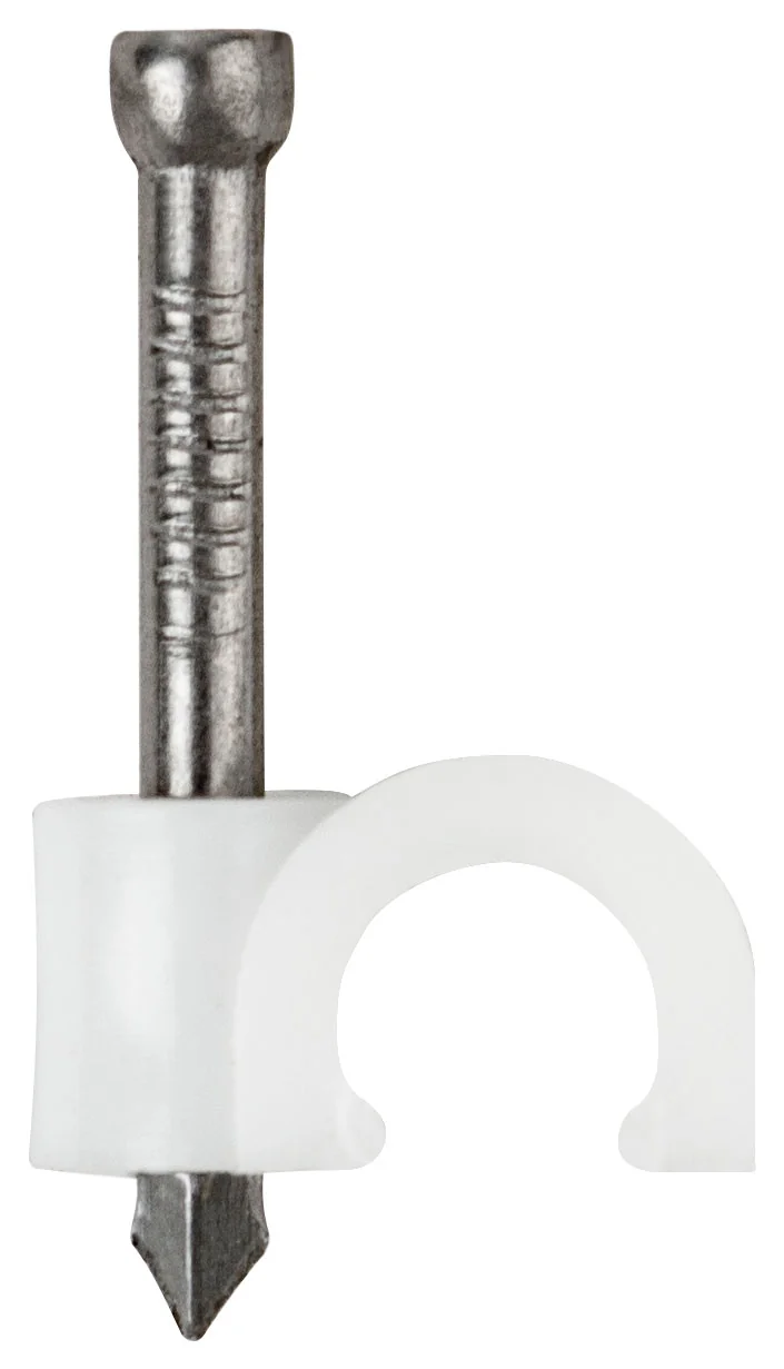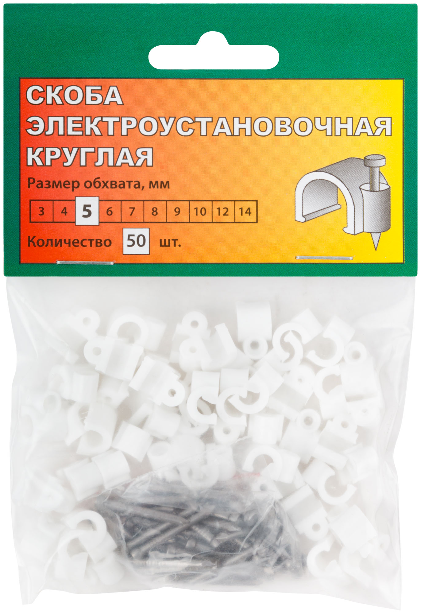 Скобы изготовлены из прочного пластика и оснащены гвоздем, что упрощает процесс монтажа. Продукт поставляется в упаковке по 50 штук, что удобно для небольших и средних проектов.