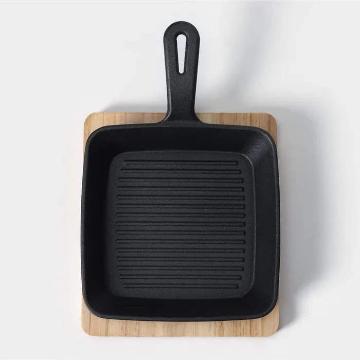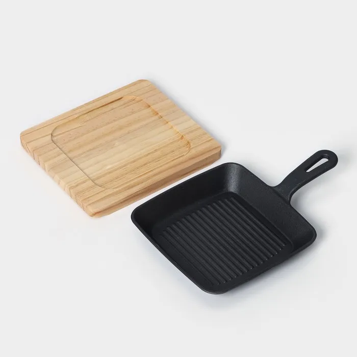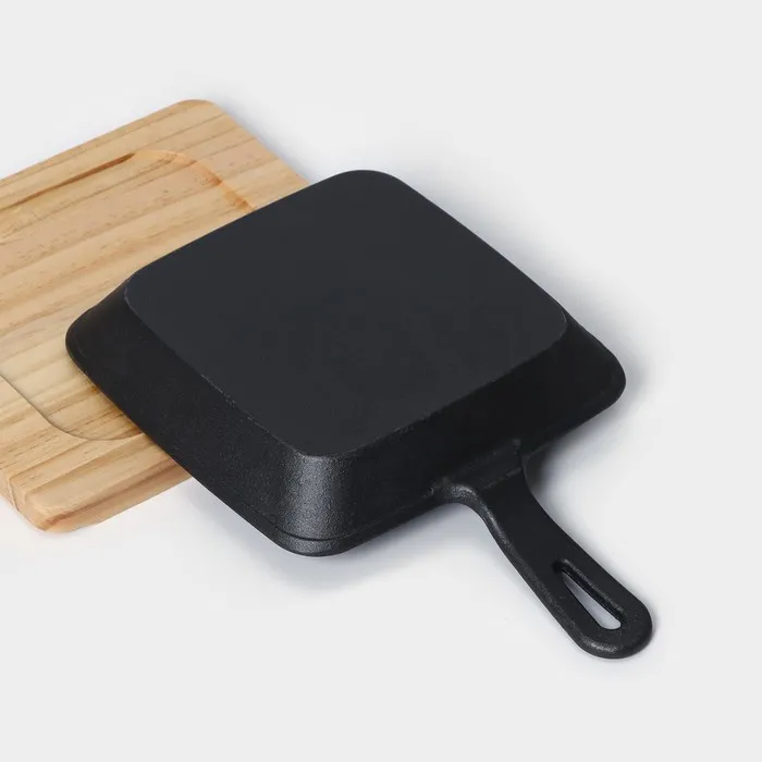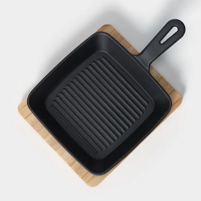 Сковорода чугунная «Квадрат. Гриль», 19×3 см, на деревянной подставке, индукция, чёрная — Характеристики