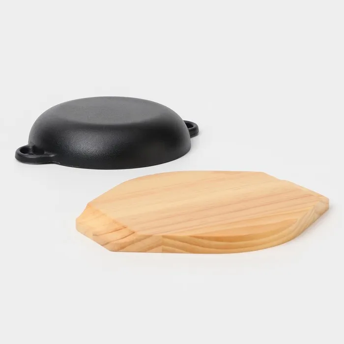 Оригинальная сервировка стола усиливает положительное впечатление от вкуса пищи. Чугунная сковорода на деревянной подставке станет лучшим способом подачи лакомств из мяса и рыбы. Угощайте гостей фирменными блюдами с пылу с жару!