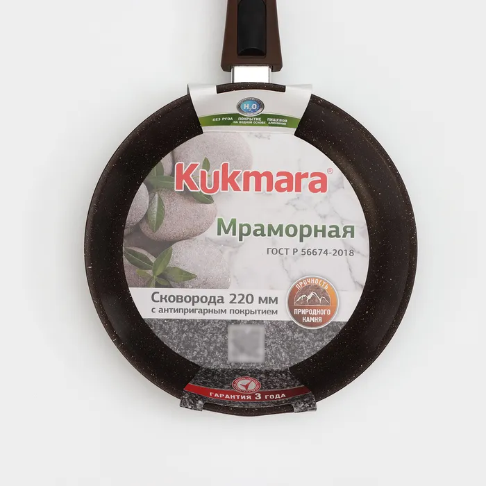 Посуда Kukmara «Мраморная» изготовлена из литого алюминия и покрыта инновационным антипригарным мраморным покрытием на водной основе, усиленным сверхтвёрдыми частицами минералов.