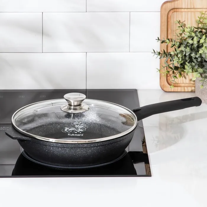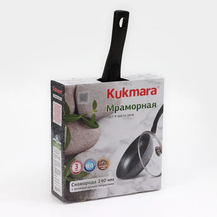 Посуда Kukmara «Мраморная» изготовлена из литого алюминия и покрыта инновационным антипригарным мраморным покрытием на водной основе, усиленным сверхтвёрдыми частицами минералов.